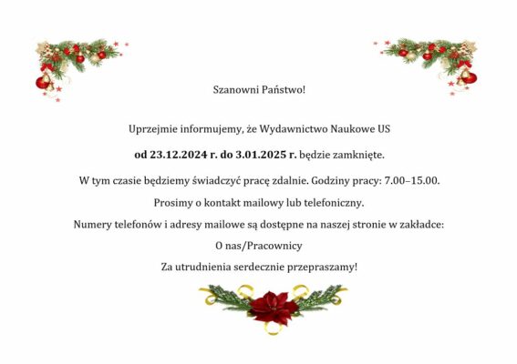 AktualnościPraca zdalna Autor Magdalena Szarmach 2025-04-09 Wł. 2024-12-19 0Informujemy, że w okresie świąteczno-noworocznym będziemy świadczyć pracę zdalnie.