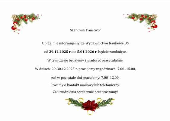 Uprzejmie informujemy, że Wydawnictwo Naukowe US od 29.12.2025 r. do 5.01.2026 r. będzie zamknięte.